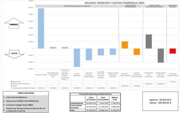 El año pasado, la parroquia obtuvo unos ingresos de 94.854,50 € y unos gastos de 100.959,95 €. La diferencia negativa entre gastos e ingresos ha supuesto una reducción de tesorería de 6.106,45 €. Al principio de 2025 contábamos con 25.150,96 € en dos cuentas (parroquia y Cáritas), siendo el resultado a final de año de 19.044,51 €.